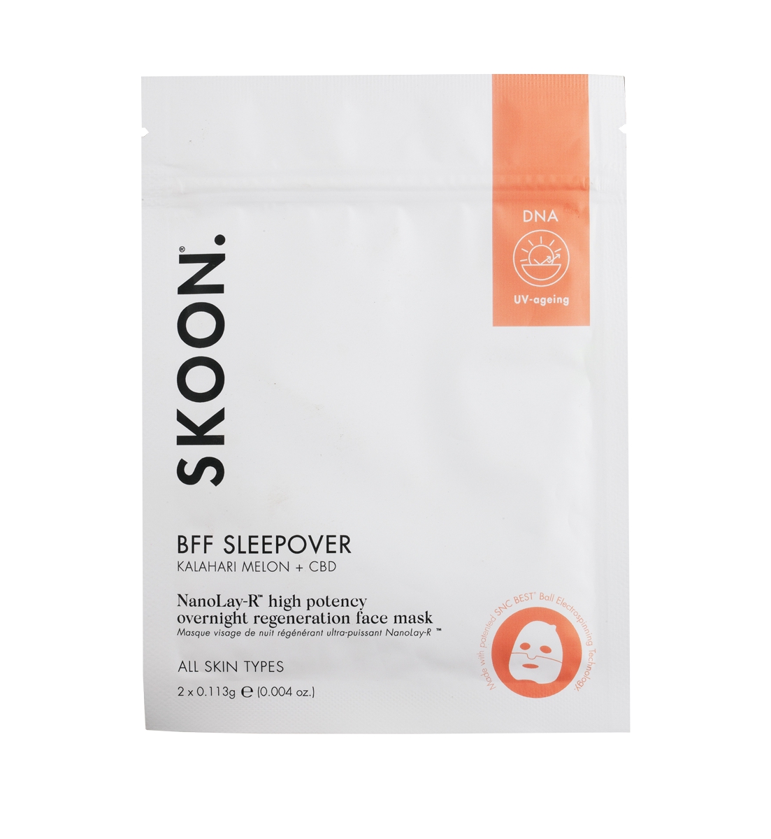 Witness the extraordinary unfold before your eyes, thanks to our groundbreaking innovation. Behold the awe-inspiring transformation of SKOON. BFF SLEEPOVER Pro-Collagen Hydrating Overnight Mask, as it morphs into delicate nanofibers meticulously layered on compostable brown parchment paper, each infused with a staggering 23% Hyaluronic Acid (HA) – all accomplished without a single preservative in sight.